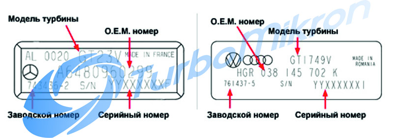 На бирке обычно имеется следующая информация: модель турбины; оригинальный номер, присвоенный автозаводом (О.Е.M.-номер); номер изделия по каталогу производителя турбин (заводской номер), и ее серийный номер. Для точного выбора нужной турбины наиболее значим номер производителя турбин (заводской номер) и/или оригинальный номер (О.Е.M.-номер).