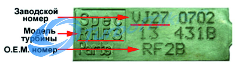 На бирке обычно имеется следующая информация: модель турбины; оригинальный номер, присвоенный автозаводом (О.Е.M.-номер); номер изделия по каталогу производителя турбин (заводской номер), и ее серийный номер. Для точного выбора нужной турбины наиболее значим номер производителя турбин (заводской номер) и/или оригинальный номер (О.Е.M.-номер).
